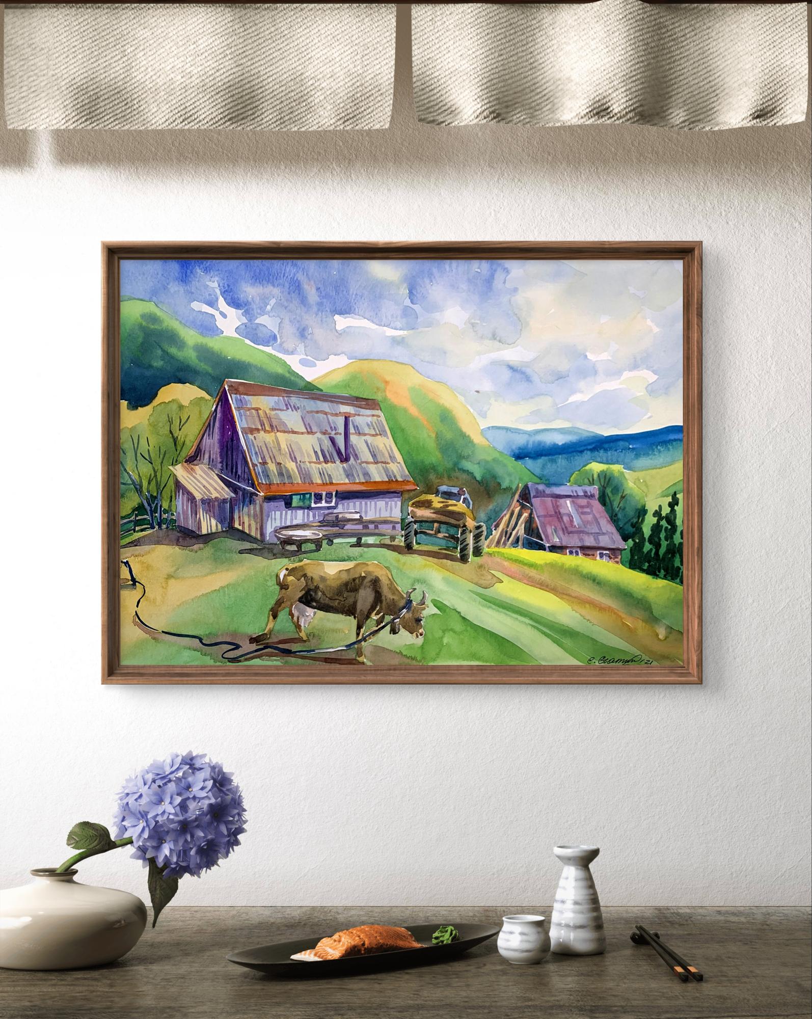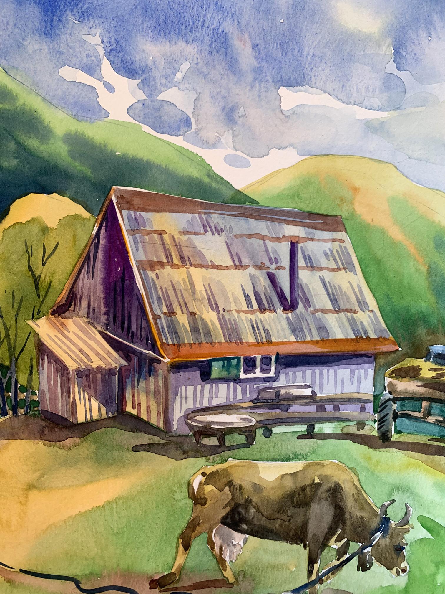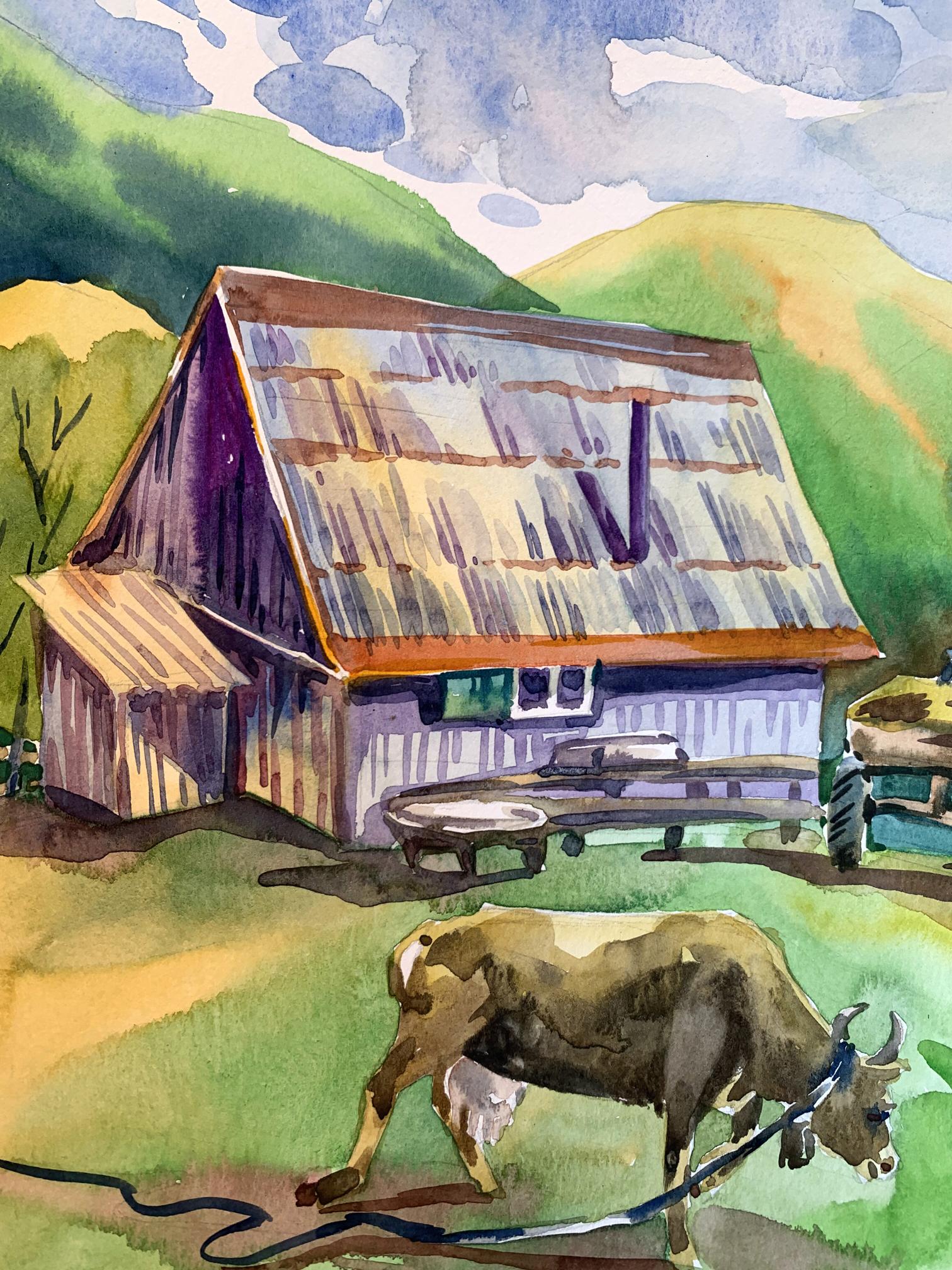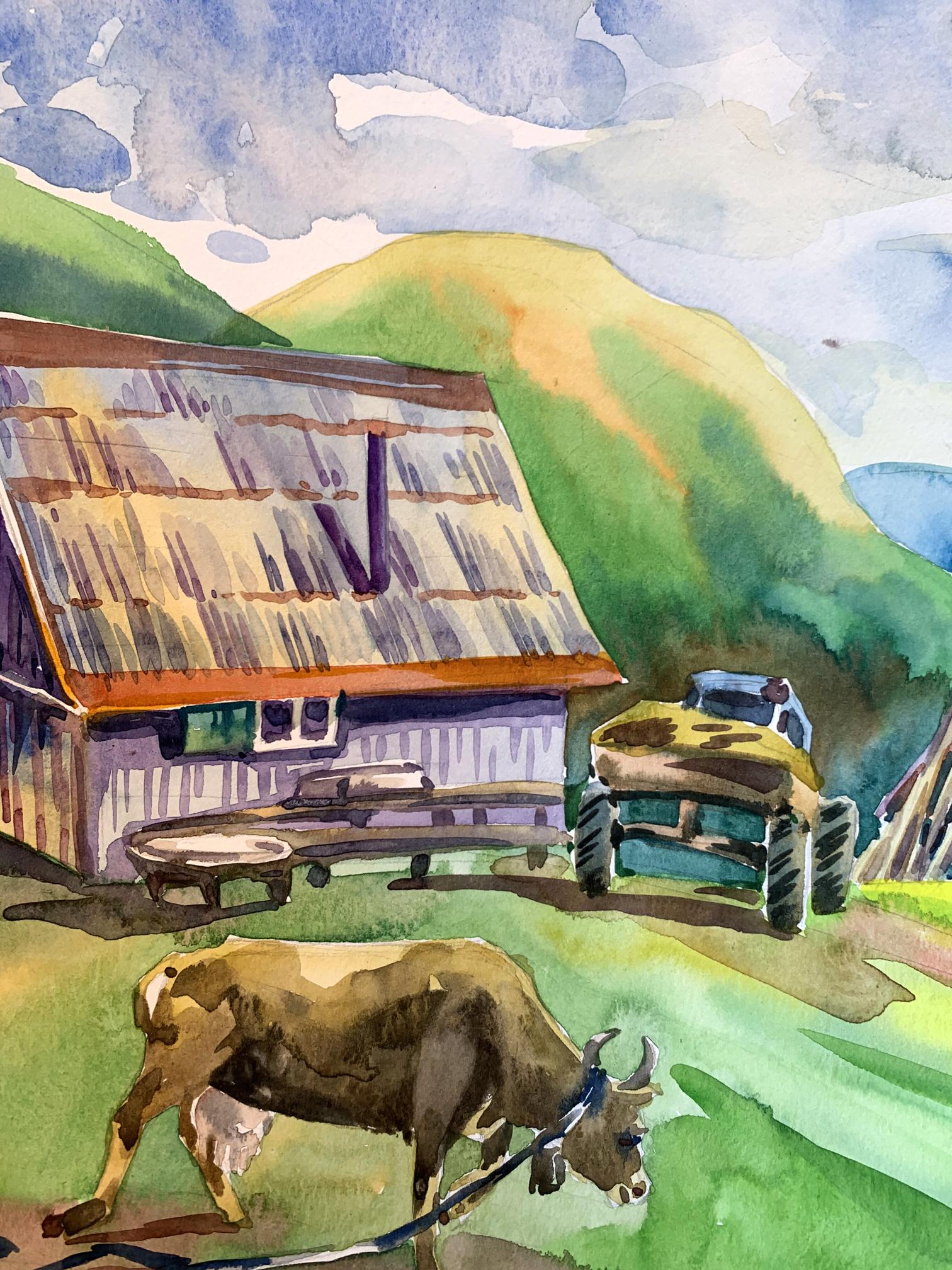 "Village in the Mountains" is a captivating watercolor painting that brings to life the serene and pastoral beauty of a rural village nestled among rolling hills. The artist uses a vibrant palette and fluid brushwork to create a scene that is both idyllic and inviting. The sky occupies the upper portion of the painting, filled with soft blues and delicate whites, suggesting a partly cloudy day. The use of light washes and the wet-on-wet technique gives the sky a gentle, airy quality. The background features a series of green and yellow hills, gradually transitioning to blue as they recede into the distance. The artist uses layering and gradient washes to create a sense of depth and distance. The central focus of the painting is a quaint village composed of traditional, rustic buildings. The structures are painted in warm earth tones, with roofs in varying shades of red, brown, and purple. The textures of the roofs and walls are rendered with precise, yet loose brushstrokes, capturing the weathered charm of rural architecture. In the foreground, a cow grazes peacefully, tethered with a rope. The cow is painted with naturalistic browns and whites, adding a touch of life to the scene. Nearby, a wooden table and benches suggest a communal outdoor space, inviting viewers to imagine the simplicity and tranquility of village life. The composition is well-balanced, with the large building on the left creating a visual anchor. The smaller structures and elements like the cow and the tractor are distributed throughout the scene, guiding the viewer's eye across the painting. The perspective is slightly elevated, allowing a broad view of the village and its surroundings. This viewpoint enhances the sense of openness and connection with nature. The rustic buildings, with their distinct roofs and textured walls, are a central element, reflecting the traditional architecture of mountain villages. The inclusion of the cow adds an element of daily life and emphasizes the pastoral nature of the scene. The lush greenery of the hills and the expansive sky frame the village, creating a harmonious blend of natural and human-made beauty. The overall mood of "Village in the Mountains" is one of peaceful rural life and natural beauty. The warm colors and gentle brushstrokes convey a sense of tranquility and timelessness, inviting viewers to pause and appreciate the simplicity and charm of village life. "Village in the Mountains" can be interpreted as a celebration of rural life and the harmony between people and nature. The painting captures a moment of quiet beauty, where the hustle and bustle of modern life seem distant and irrelevant. Overall, "Village in the Mountains" is a beautifully rendered watercolor painting that conveys the serene and pastoral charm of a mountain village. The artist's use of color, composition, and detailed brushwork creates a vivid and inviting scene that transports viewers to a place of tranquility and natural beauty.