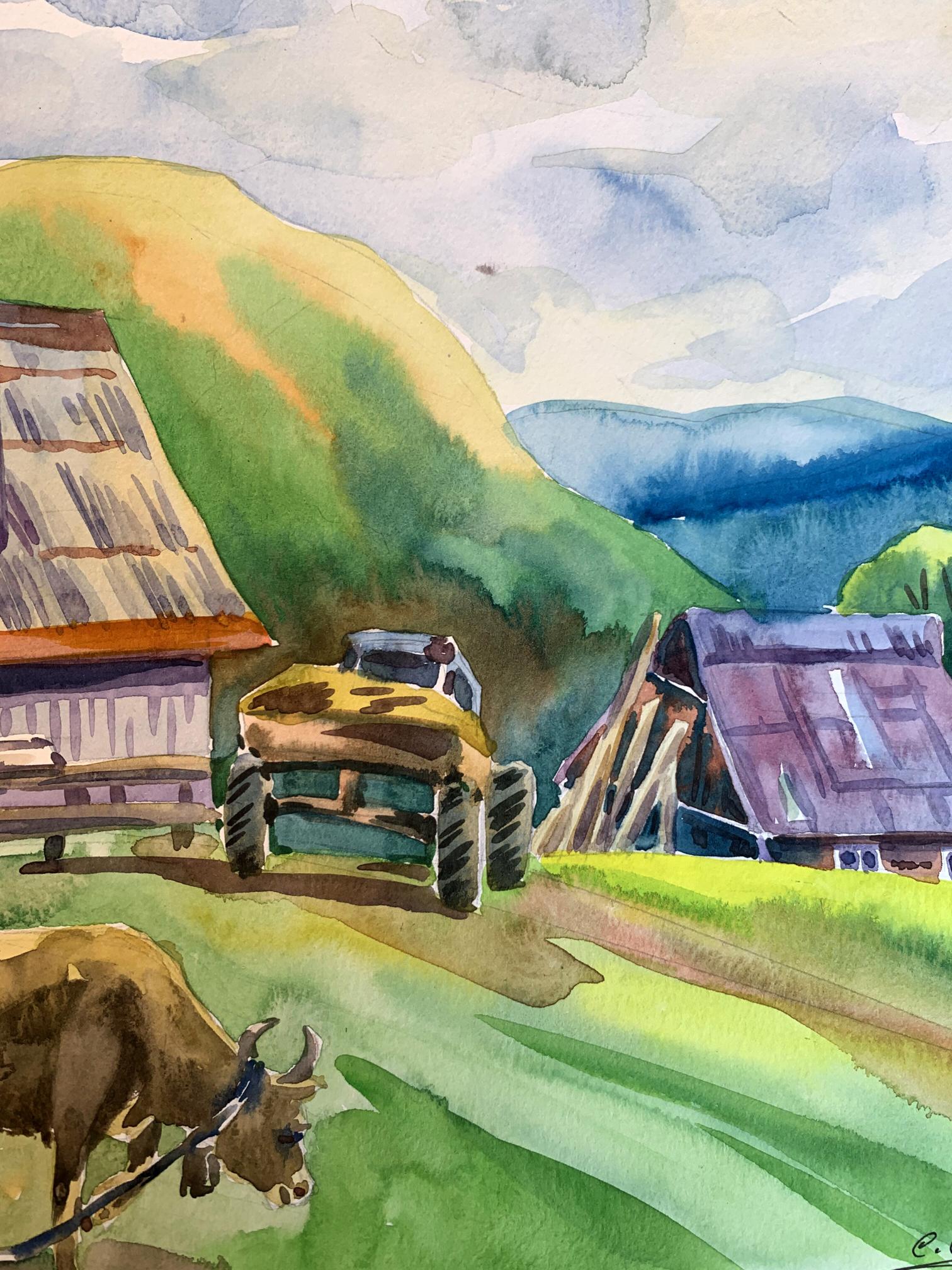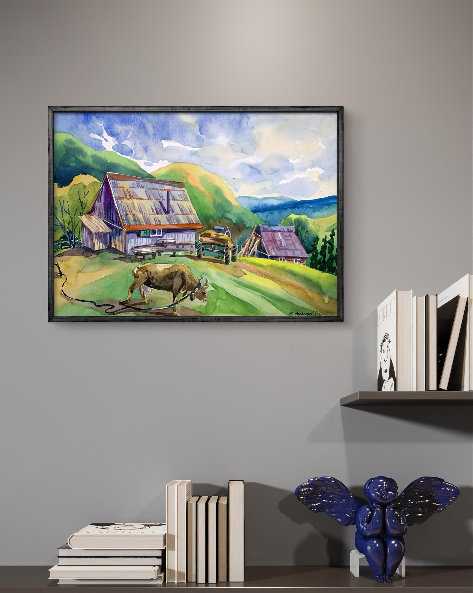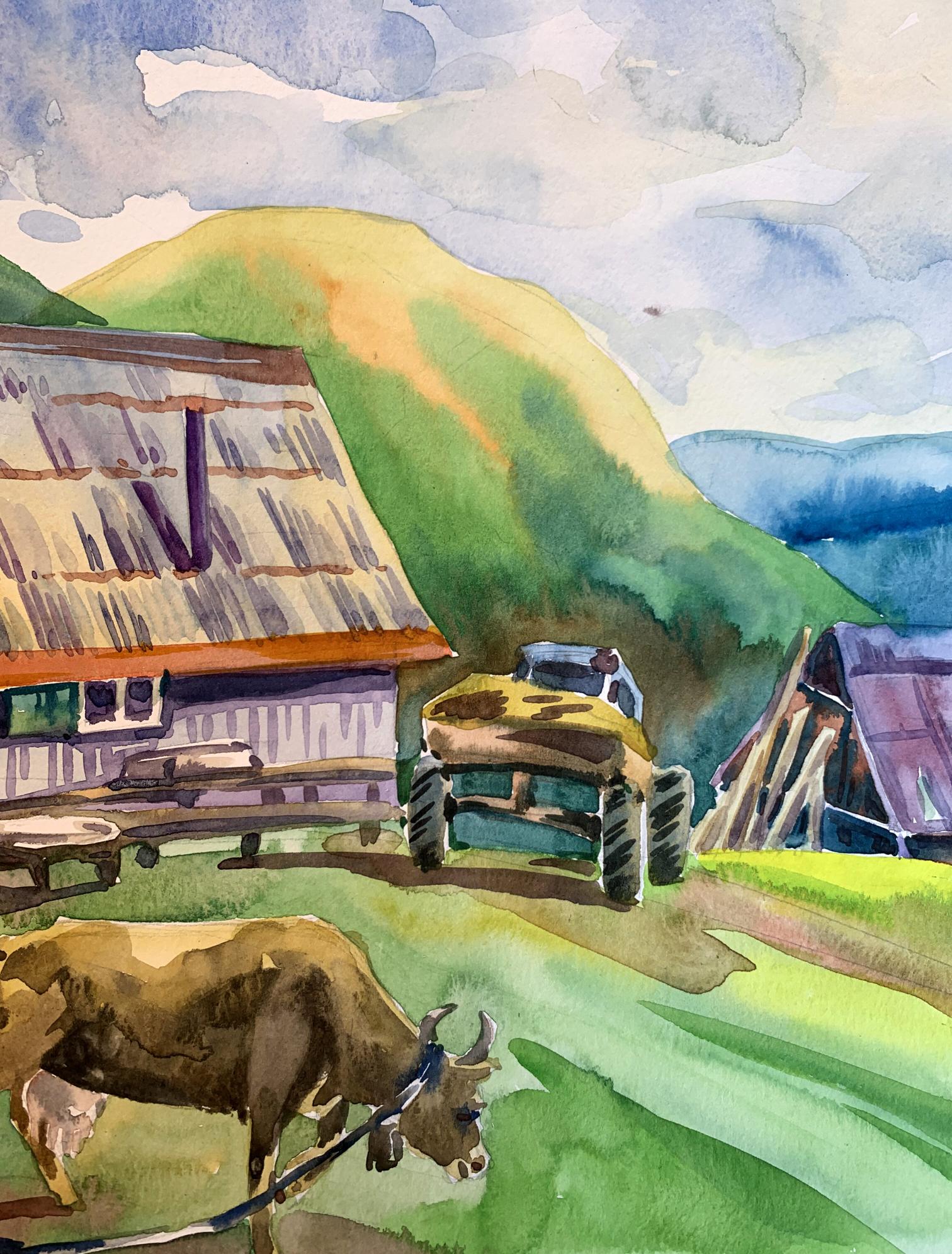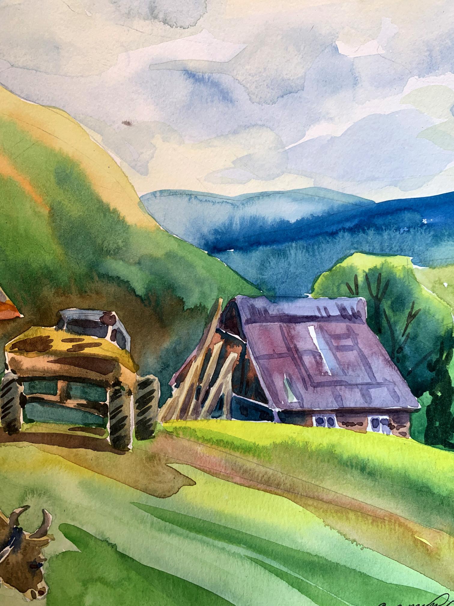 "Village in the Mountains" is a captivating watercolor painting that brings to life the serene and pastoral beauty of a rural village nestled among rolling hills. The artist uses a vibrant palette and fluid brushwork to create a scene that is both idyllic and inviting. The sky occupies the upper portion of the painting, filled with soft blues and delicate whites, suggesting a partly cloudy day. The use of light washes and the wet-on-wet technique gives the sky a gentle, airy quality. The background features a series of green and yellow hills, gradually transitioning to blue as they recede into the distance. The artist uses layering and gradient washes to create a sense of depth and distance. The central focus of the painting is a quaint village composed of traditional, rustic buildings. The structures are painted in warm earth tones, with roofs in varying shades of red, brown, and purple. The textures of the roofs and walls are rendered with precise, yet loose brushstrokes, capturing the weathered charm of rural architecture. In the foreground, a cow grazes peacefully, tethered with a rope. The cow is painted with naturalistic browns and whites, adding a touch of life to the scene. Nearby, a wooden table and benches suggest a communal outdoor space, inviting viewers to imagine the simplicity and tranquility of village life. The composition is well-balanced, with the large building on the left creating a visual anchor. The smaller structures and elements like the cow and the tractor are distributed throughout the scene, guiding the viewer's eye across the painting. The perspective is slightly elevated, allowing a broad view of the village and its surroundings. This viewpoint enhances the sense of openness and connection with nature. The rustic buildings, with their distinct roofs and textured walls, are a central element, reflecting the traditional architecture of mountain villages. The inclusion of the cow adds an element of daily life and emphasizes the pastoral nature of the scene. The lush greenery of the hills and the expansive sky frame the village, creating a harmonious blend of natural and human-made beauty. The overall mood of "Village in the Mountains" is one of peaceful rural life and natural beauty. The warm colors and gentle brushstrokes convey a sense of tranquility and timelessness, inviting viewers to pause and appreciate the simplicity and charm of village life. "Village in the Mountains" can be interpreted as a celebration of rural life and the harmony between people and nature. The painting captures a moment of quiet beauty, where the hustle and bustle of modern life seem distant and irrelevant. Overall, "Village in the Mountains" is a beautifully rendered watercolor painting that conveys the serene and pastoral charm of a mountain village. The artist's use of color, composition, and detailed brushwork creates a vivid and inviting scene that transports viewers to a place of tranquility and natural beauty.